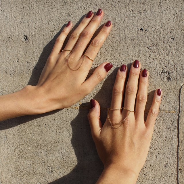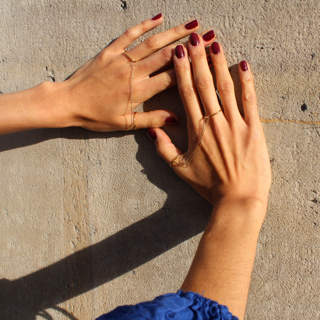 Une pièce audacieuse à l’esprit minimaliste : deux anneaux fins, ajustables, à porter sur des doigts différents, reliés par une ou trois chaînes, selon la variante choisie