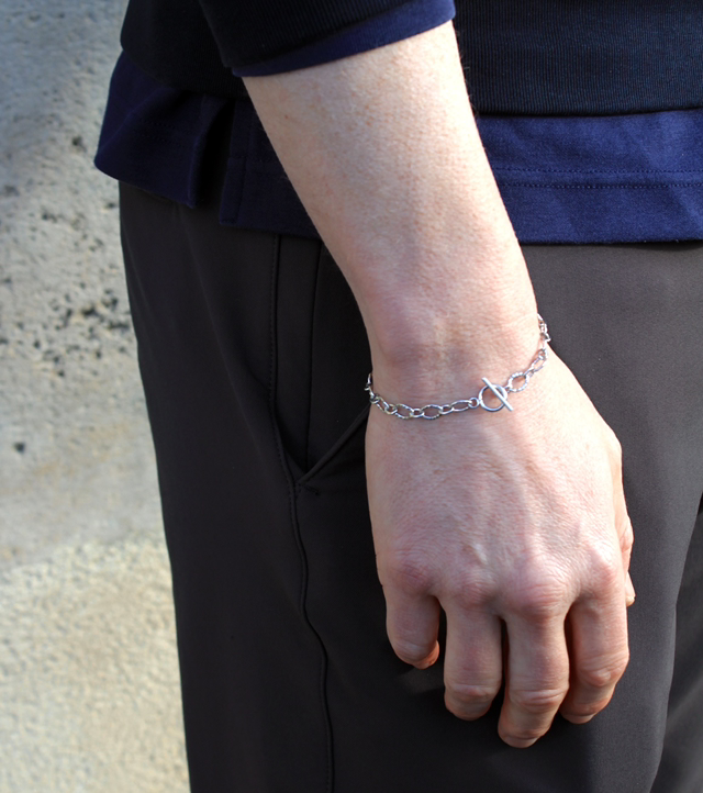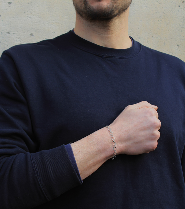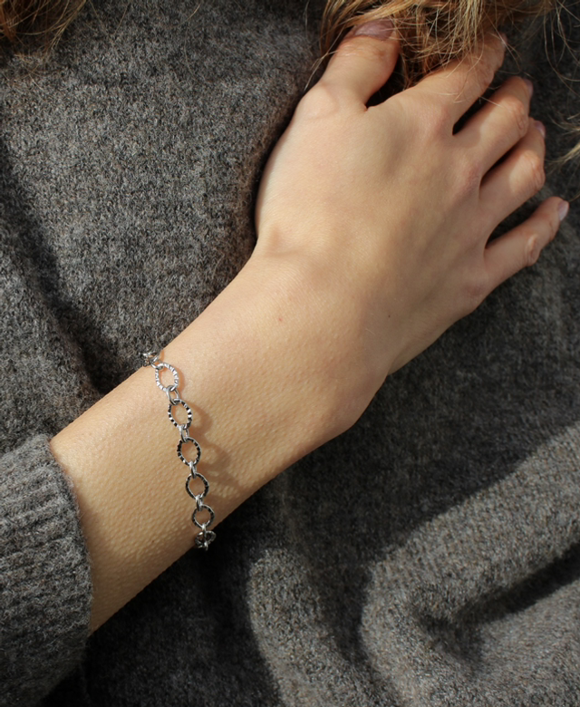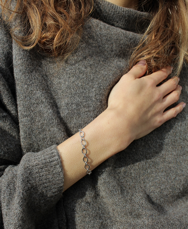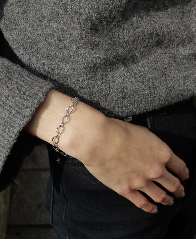 Une chaîne aux maillons ovales striés compose l’ensemble du bracelet. Les reliefs captent la lumière et créent une vibration discrète qui accompagne le poignet au fil de la journée.