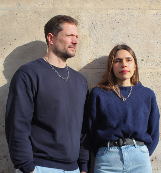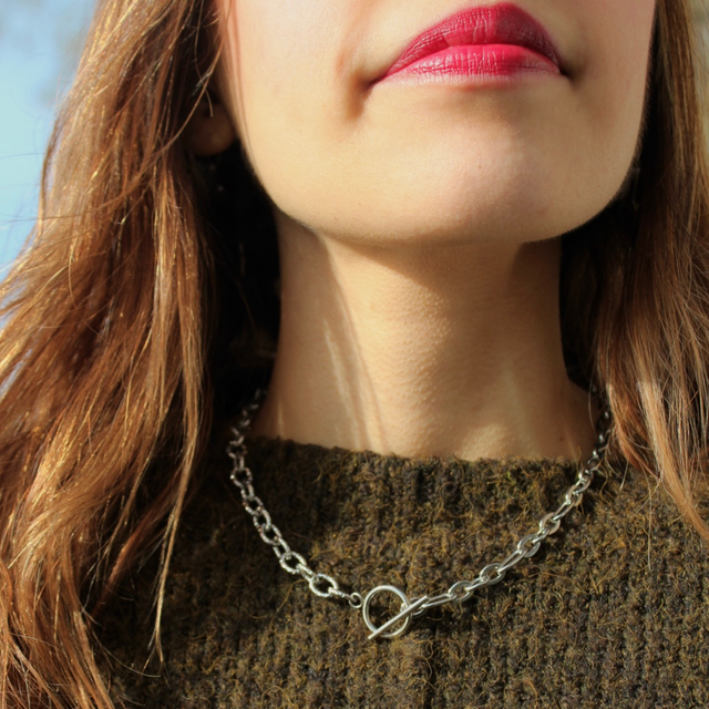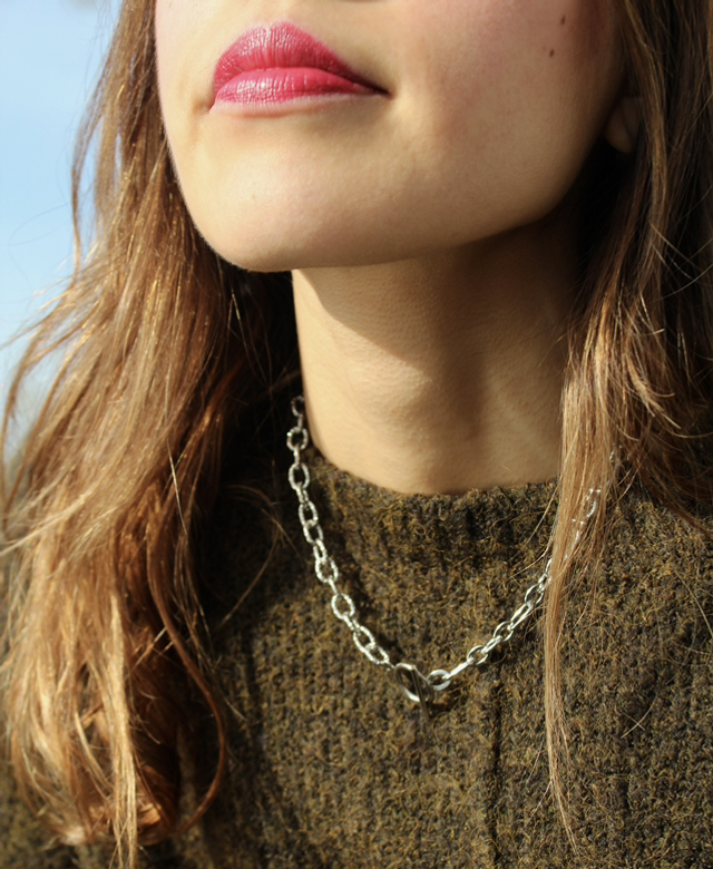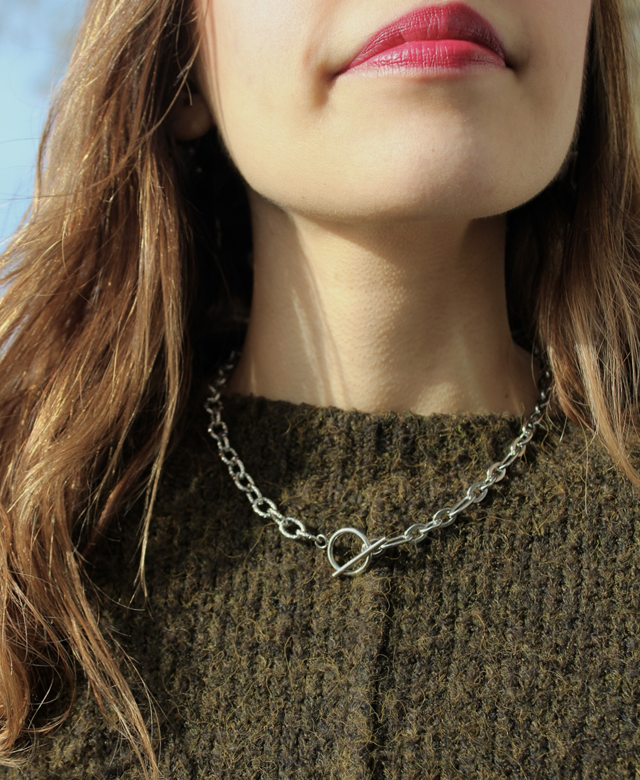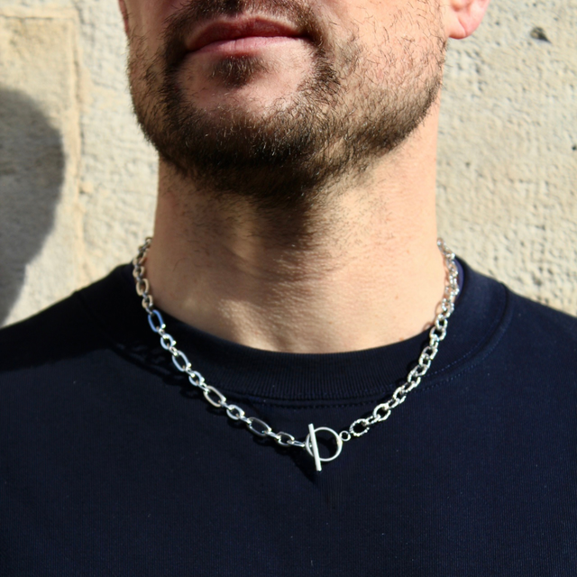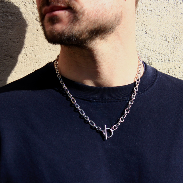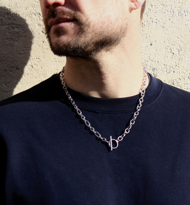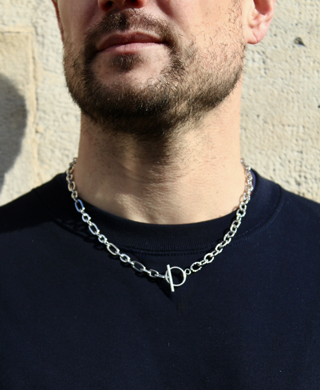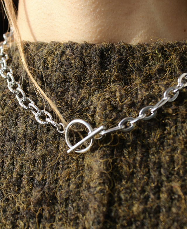 Deux chaînes se répondent, l’une alternant maillons imposants et plus petits, l’autre dentelée et sculpturale. Le fermoir en T rond devient le point de connexion, soulignant la singularité du bijou, qui s’impose avec élégance autour du cou.